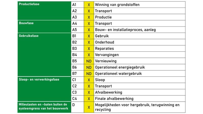 X: Module included in the LCA study ND: Not declared