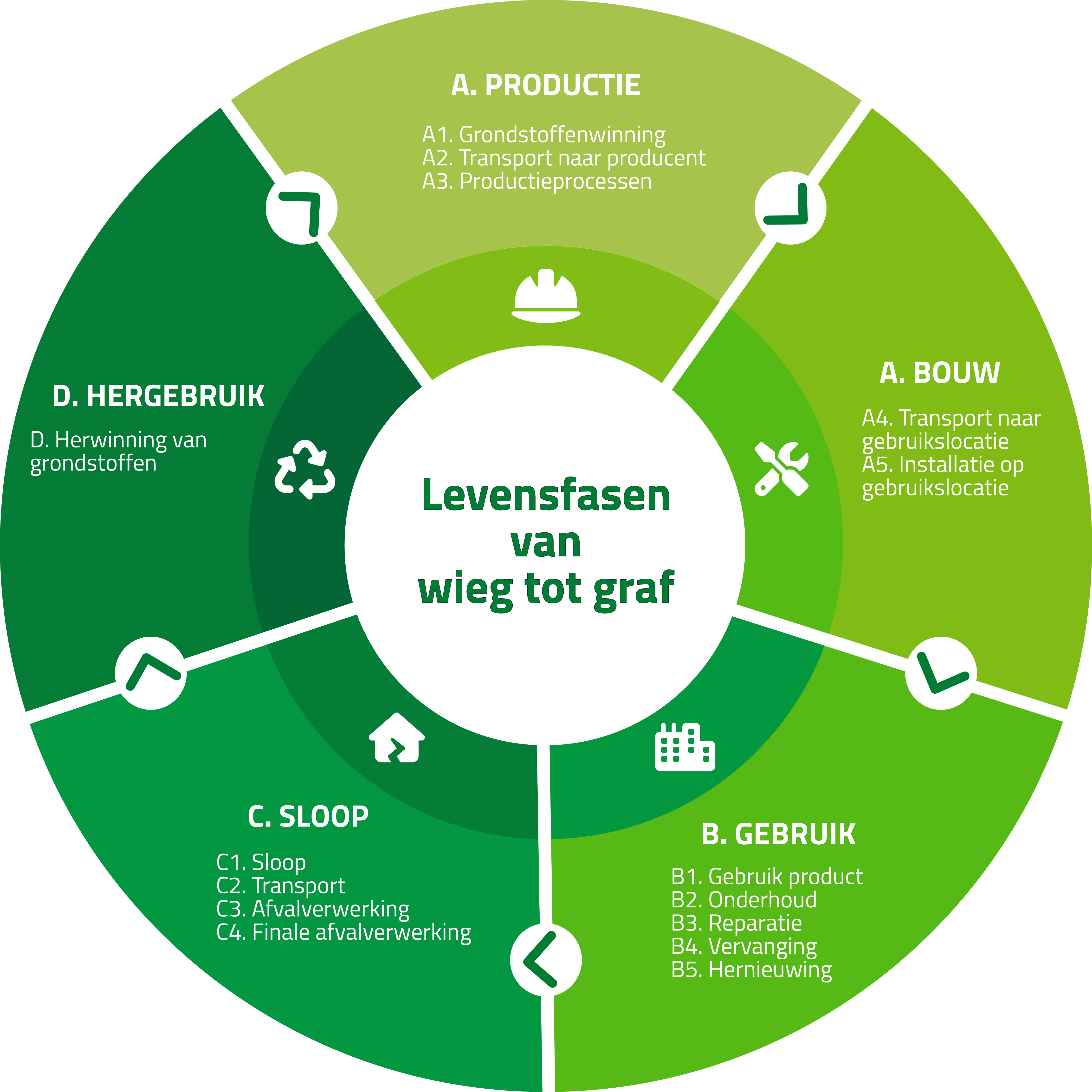 When drawing up a 'Life Cycle Analysis' (LCA), you measure the effects of a product on the environment in its various life phases. In the EN 15804 LCA methodology, 19 categories of environmental impacts are examined. These include effects related to the depletion of our resources (use of raw materials, energy, water and land) and to the emission of harmful and hazardous substances (greenhouse gases, nitrogen and toxic substances). In short, an LCA examines for a product the withdrawals from the environment and the emissions to the environment. The study is carried out with regard to all life phases of the product, i.e. from extraction of raw materials through production, use and reuse to waste disposal. In other words, from cradle to grave.
