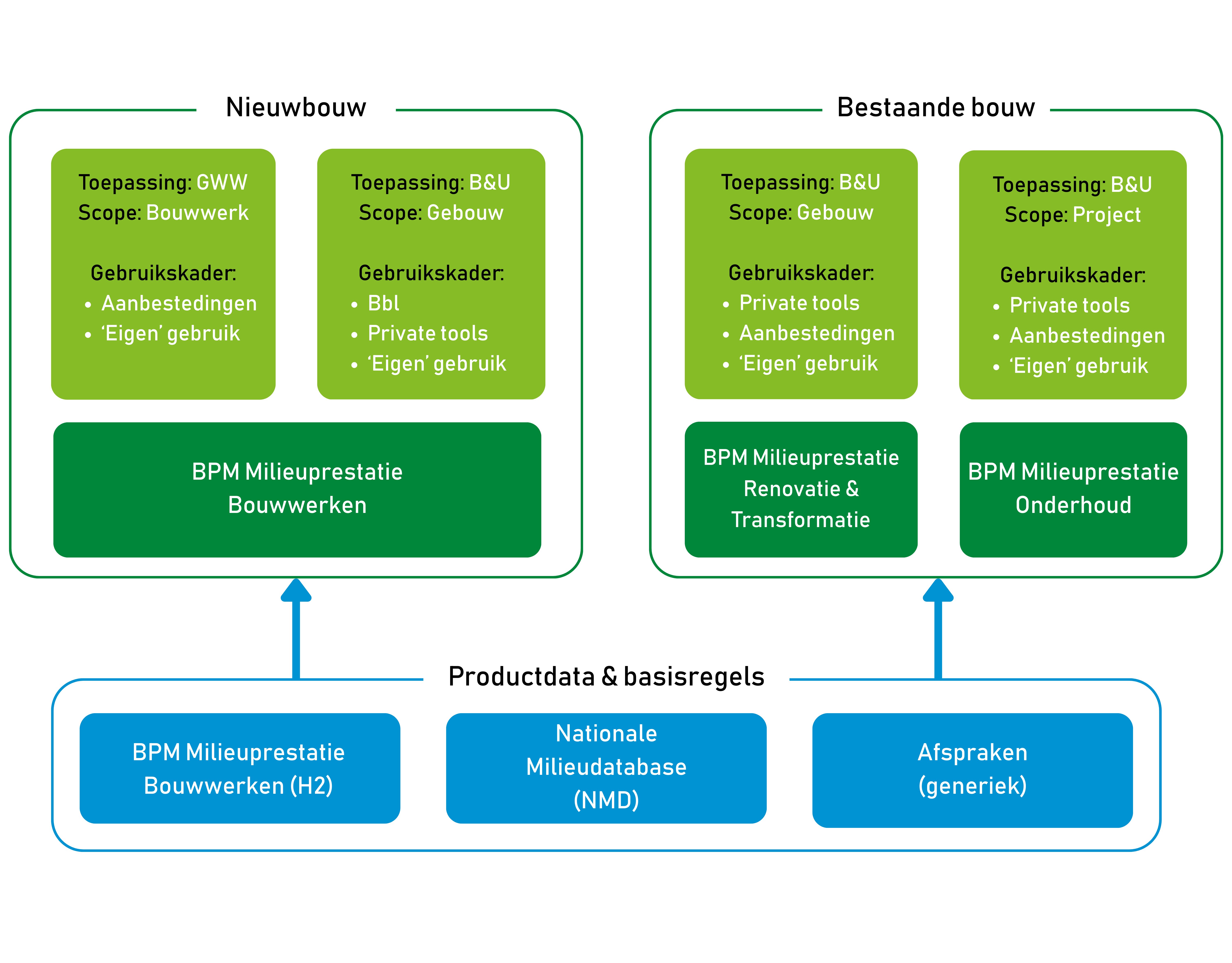 Deze methodes bevatten rekenregels op bouwwerkniveau en bestaan naast de Bepalingsmethode Milieuprestatie Bouwwerken, waarin de rekenregels voor nieuwbouw zijn vastgelegd. De berekeningen voor de bestaande bouw maken gebruik van productdata uit de Nationale Milieudatabase, die is opgesteld volgens de productrekenregels (hoofdstuk 2) van de Bepalingsmethode Milieuprestatie Bouwwerken.