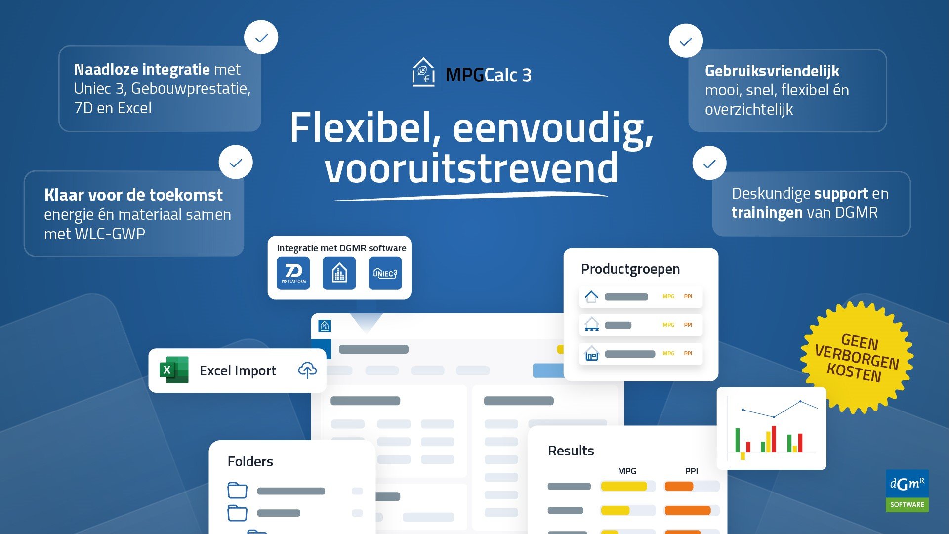 Wij zijn DGMR Software. Wij maken al 30 jaar software voor de verduurzaming van gebouwen. Ons rekeninstrument is MPGCalc 3, deze is sinds oktober 2025 live. Daarmee zoeken we heel erg de synergie met ons andere product: Uniec 3. MPGCalc 3 is voor bouwmaterialen en Uniec 3 is voor het berekenen van de energieprestatie van gebouwen.