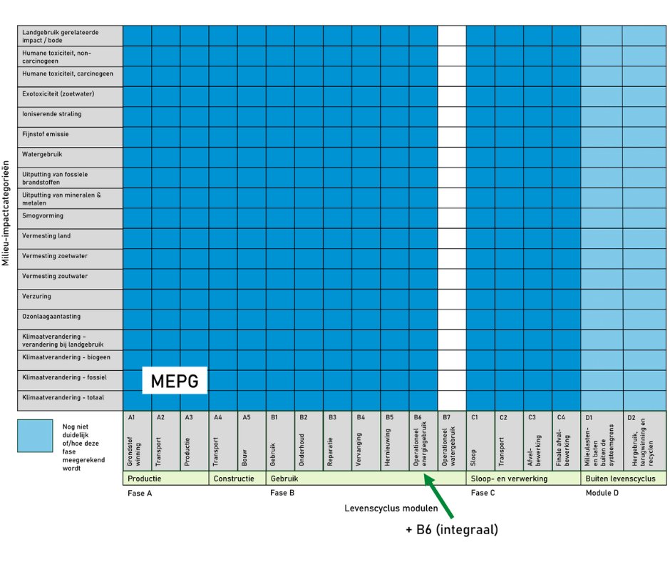De MPG is sinds 2013 verankerd in de Nederlandse bouwregelgeving. Deze berekening geeft inzicht in de milieuprestatie van een gebouw aan de hand van meerdere milieu-impactcategorieën, gewogen tot één score.