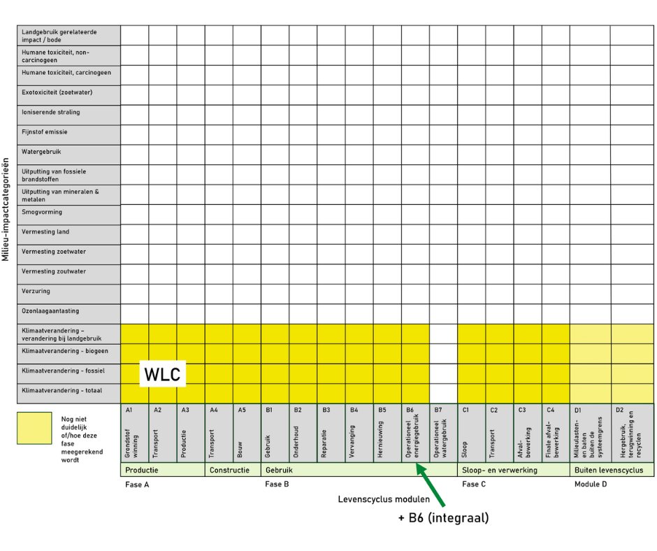 De Verzamelwet Klimaat en Groene Groei (juli 2025) bevat bepalingen die de weg vrijmaken voor de wettelijke verankering van WLC-GWP -berekeningen. Er wordt aangesloten bij Europese ontwikkelingen, zoals de herziening van de EPBD (Energy Performance of Buildings Directive).